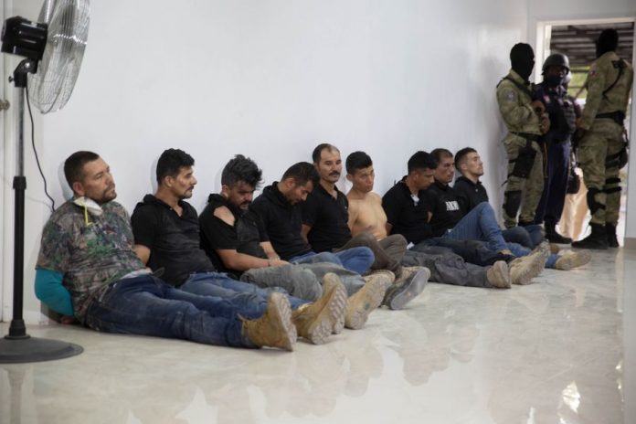 Police Chief Leon Charles paraded 17 men before journalists at a news conference late on Thursday, showing a number of Colombian passports, plus assault rifles, machetes, walkie-talkies and materials including bolt cutters and hammers.